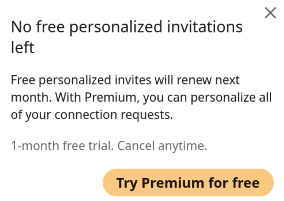 LinkedIn drängt seine Nutzer schon immer zu kostenpflichtigen Abonnements. Kürzlich wurde für einen Großteil der Nutzer die Anzahl der personalisierten Einladungen (d. h. mit Einladungstext; Einladungen ohne Text sind nicht limitiert) pro Monat begrenzt: