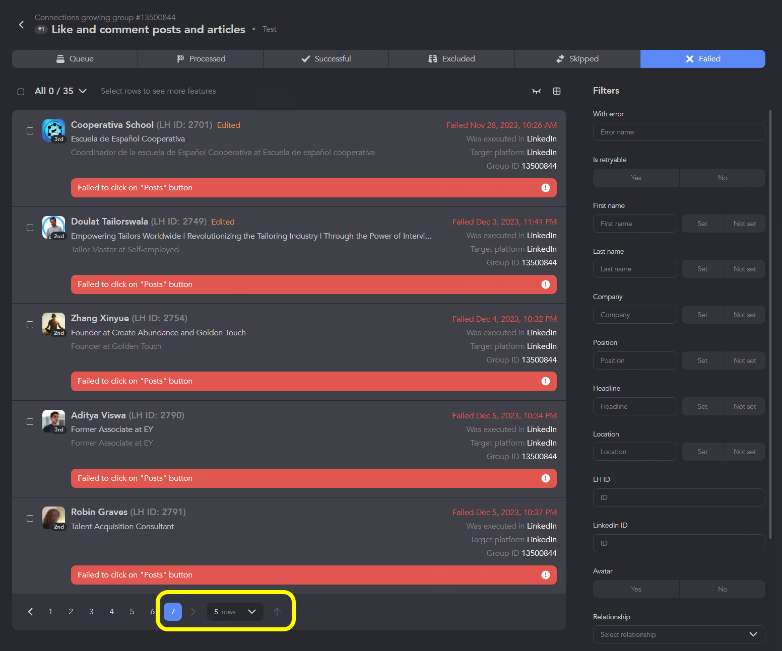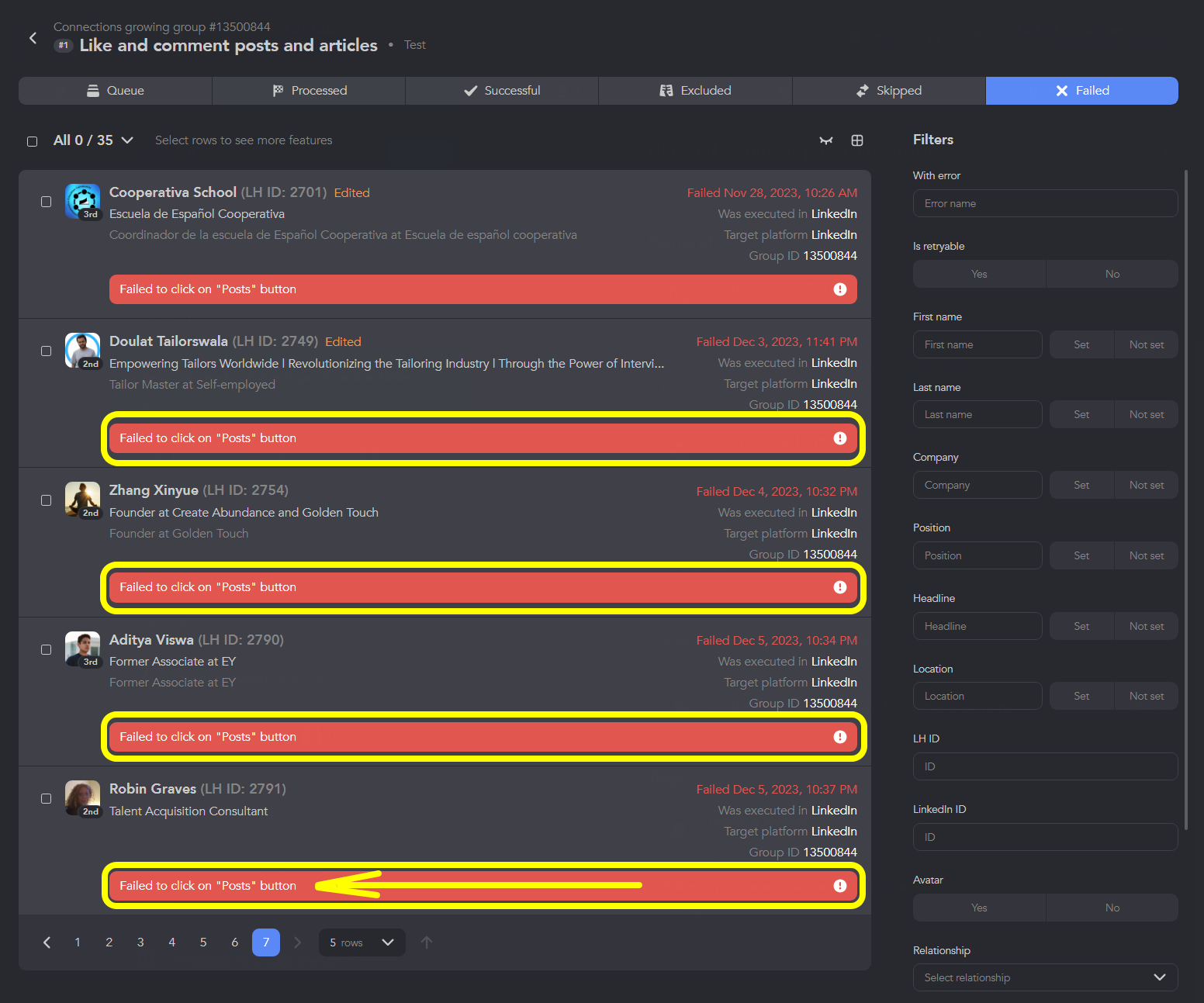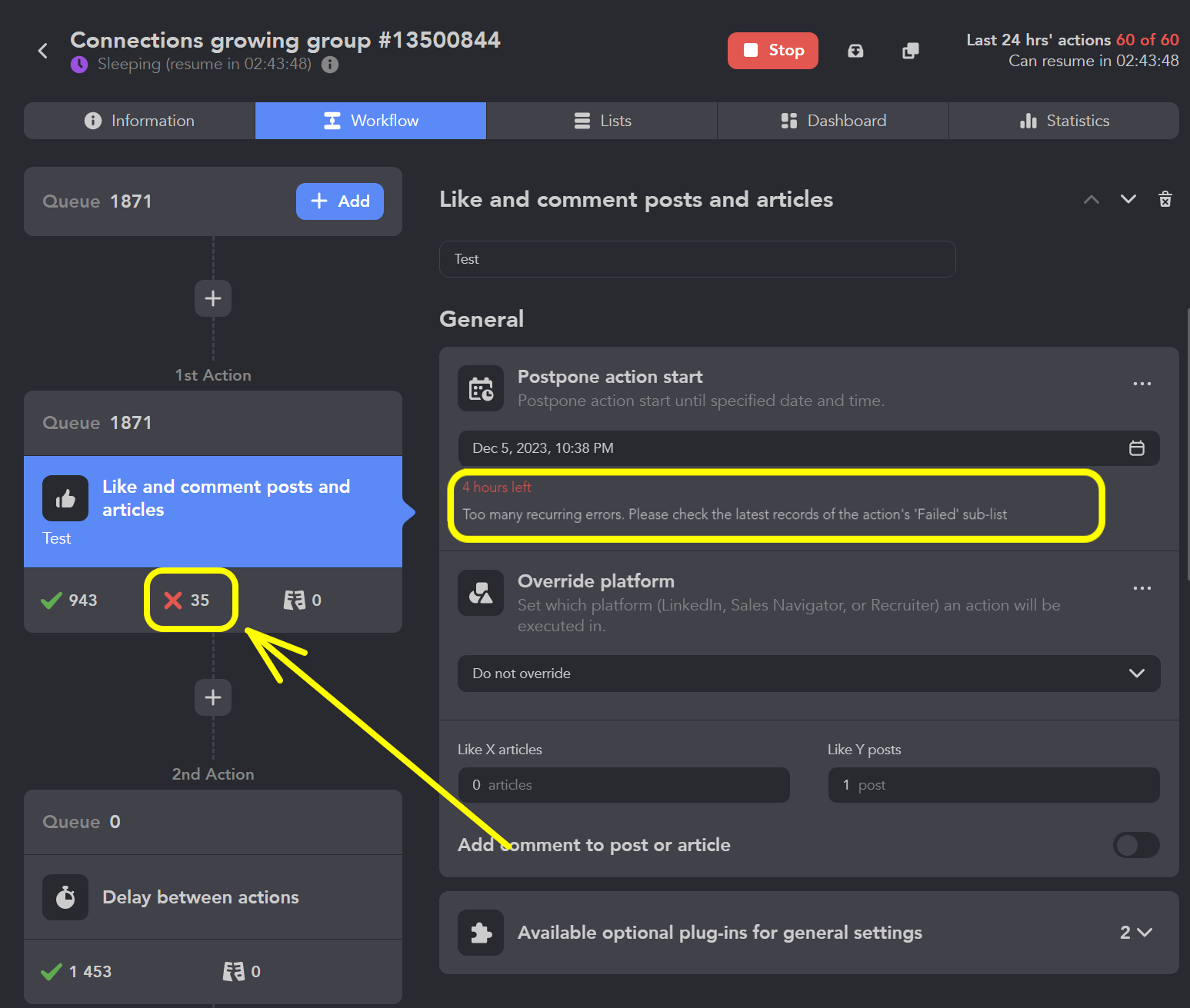Linked Helper ist so programmiert, dass eine Aktion für 4 Stunden gestoppt wird, wenn 5 Profile hintereinander mit demselben Fehler fehlschlagen, sofern der Fehler für LinkedIn verdächtig erscheint. Zum Beispiel, wenn Profile nicht eingeladen werden können, weil LinkedIn ein Update hatte, sie aber manuell eingeladen werden könnten.