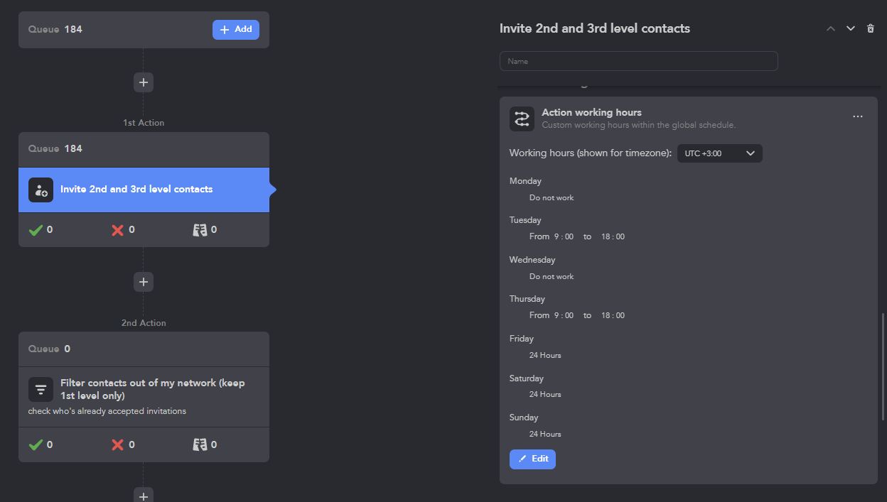 In Linked Helper können Sie auch für jede Aktion einen eigenen Zeitplan mit dem Plug-in „Aktion Arbeitszeiten“ erstellen. Es kann vorkommen, dass Sie nur eine aktive Kampagne mit nur einer Aktion haben, die Profile zu verarbeiten hat, und diese Aktion durch den eigenen Zeitplan eingeschränkt wird.