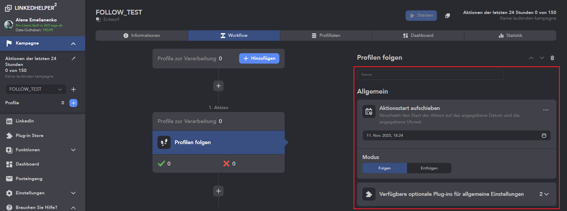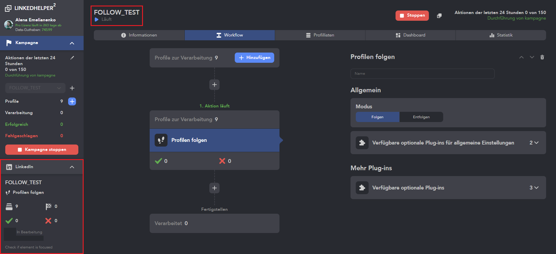 Sobald die Kampagne gestartet ist, sehen Sie, dass sich der Status der Kampagne auf Aktiv geändert hat. Im LinkedIn-Menü auf der linken Seite zeigt Ihnen Linked Helper an, wann der nächste Schritt ausgeführt wird, welcher Schritt das ist und welches Profil als nächstes verarbeitet wird.