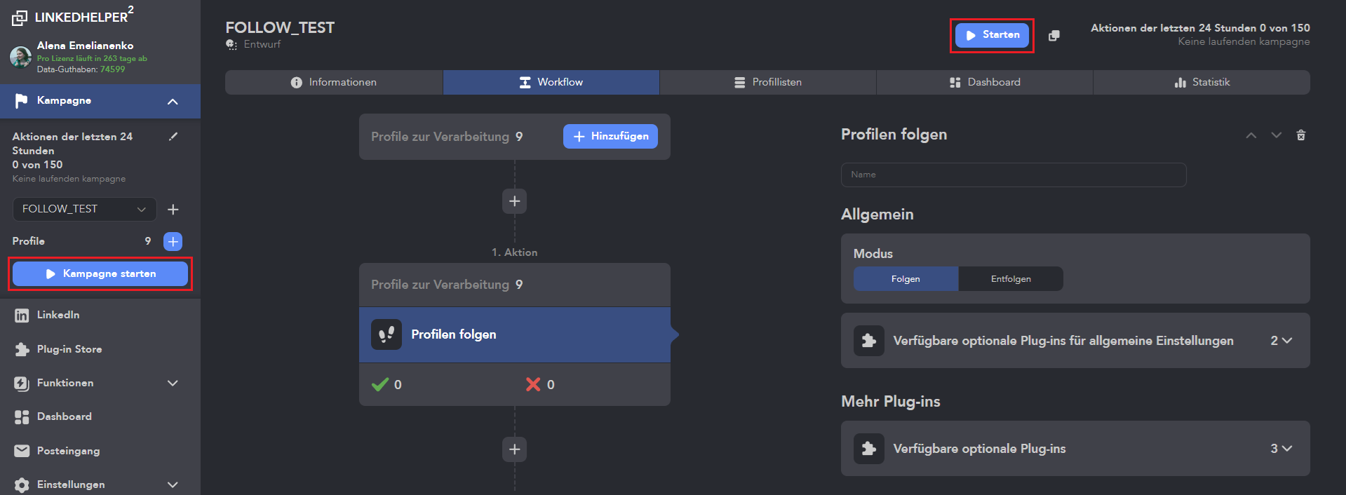 Um die Kampagne zu starten, klicken Sie im linken Menü auf Kampagne starten oder oben auf die Start-Schaltfläche: