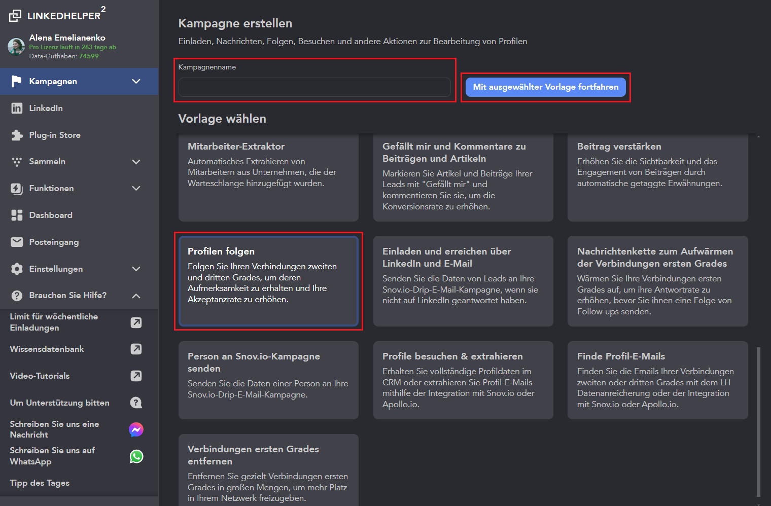 Geben Sie im Pop-up-Fenster Ihrer Kampagne einen Namen, wählen Sie die gewünschte Vorlage – Profilen folgen – und klicken Sie auf Kampagne erstellen (4).