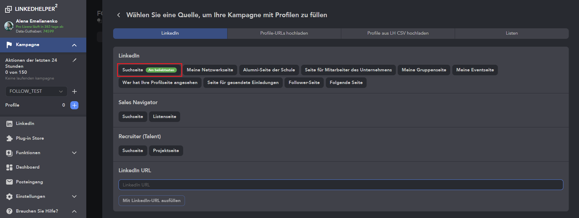 Wählen Sie eine Quelle aus, von der Sie Profile sammeln möchten (z. B. LinkedIn-Suchseite).