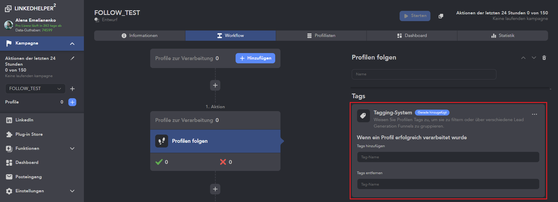 Linked Helper kann nach der Verarbeitung eines Profils automatisch Tags zuweisen oder entfernen. Gehen Sie dazu in den Reiter Tags der Aktion, geben Sie einen Tag-Namen ein und drücken Sie die Enter-Taste auf Ihrer Tastatur: Wie verwende ich Tags in Linked Helper?