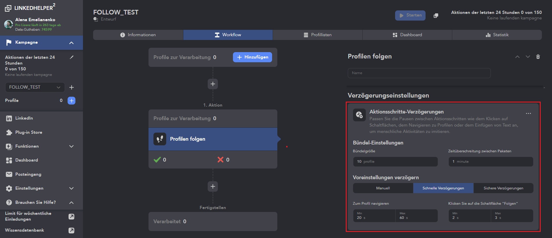 Im Reiter Verzögerungseinstellungen können Sie Bündelgröße und Timeout zwischen Bündeln anpassen, um die täglich verarbeiteten Profile für diese Aktion zu begrenzen. Sie können die Zeitüberschreitungen mit einem Klick oder einzeln anpassen, um Probleme mit LinkedIn zu vermeiden: