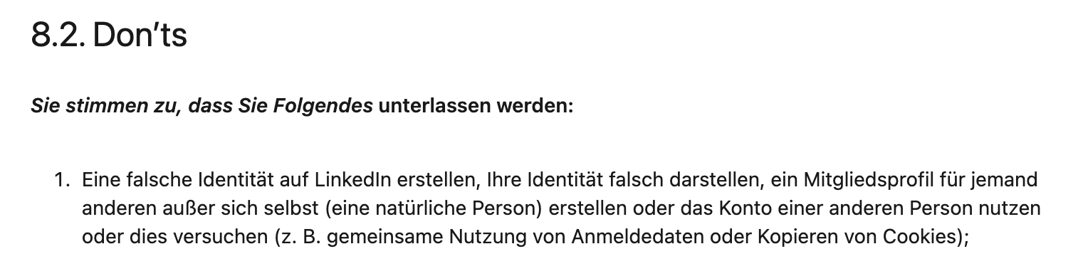 Wenn Sie die LinkedIn-Nutzungsbedingungen gelesen haben, wissen Sie bereits, dass LinkedIn das Teilen Ihres Kontos mit anderen oder die Nutzung fremder Konten untersagt: