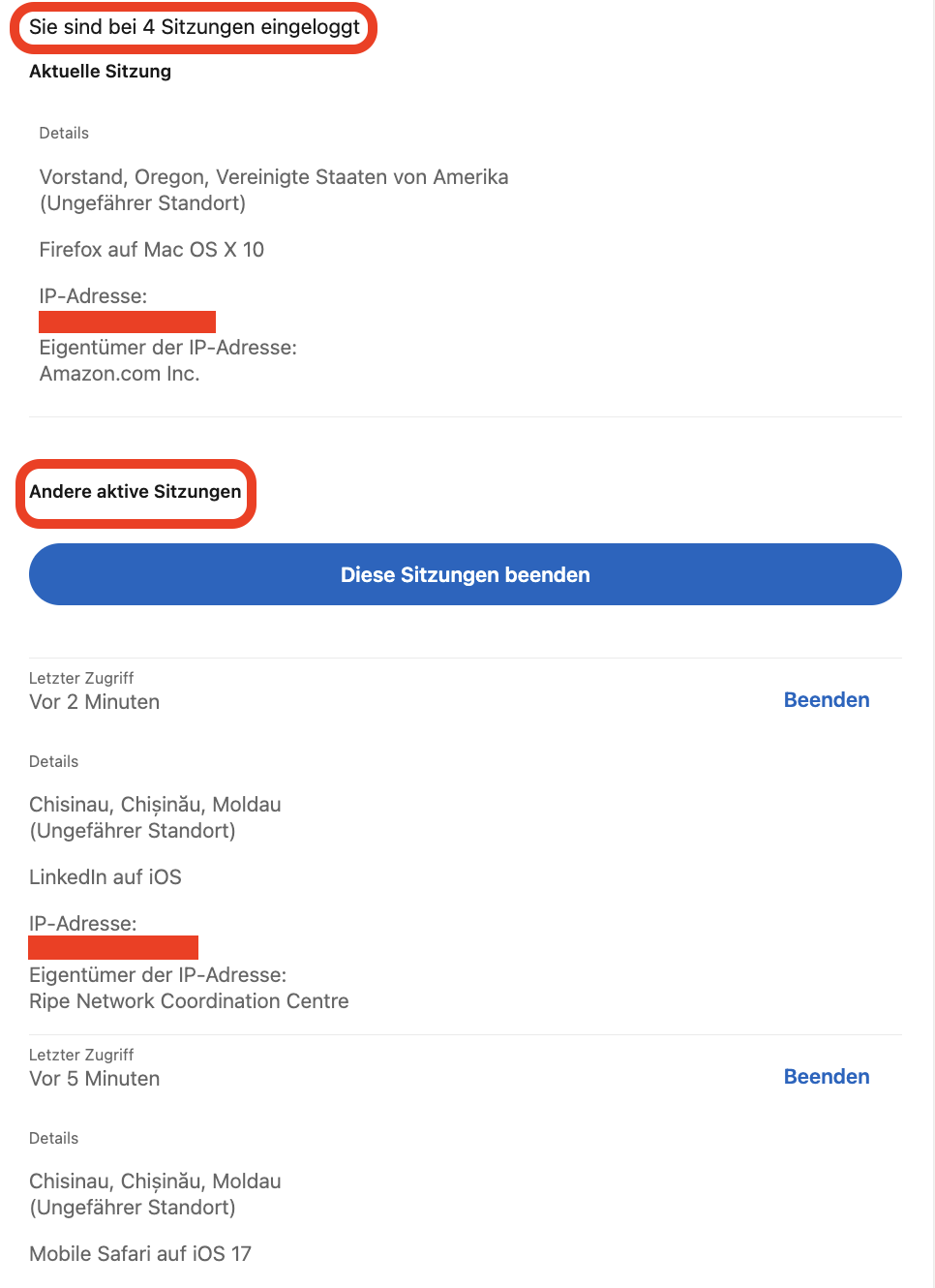 F: LinkedIn zeigt viele aktive Sitzungen an – ist das in Ordnung?