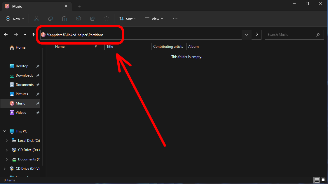 - Fügen Sie %appdata%\linked-helper\Partitions in die Adresszeile ein und drücken Sie die Eingabetaste: