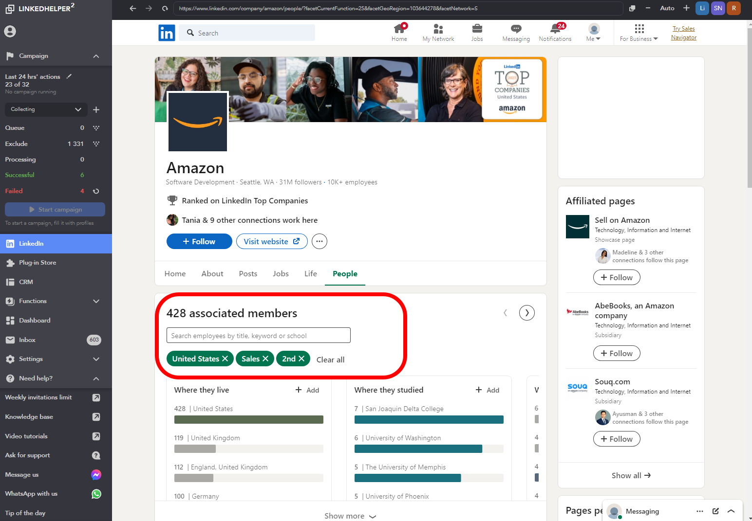 - Unternehmensmitarbeiterseite – Sie können Filter verwenden, um Mitarbeiter eines bestimmten Unternehmens in LinkedIn zu sammeln: