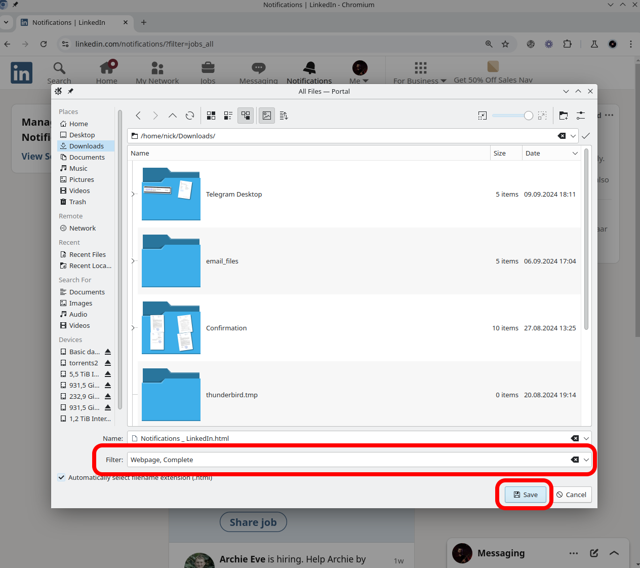 - Öffnen Sie in Ihrem Browser eine LinkedIn-Seite, von der Sie URLs sammeln möchten (z. B. den Jobs-Tab der Benachrichtigungen – https://www.linkedin.com/notifications/?filter=jobs_all).