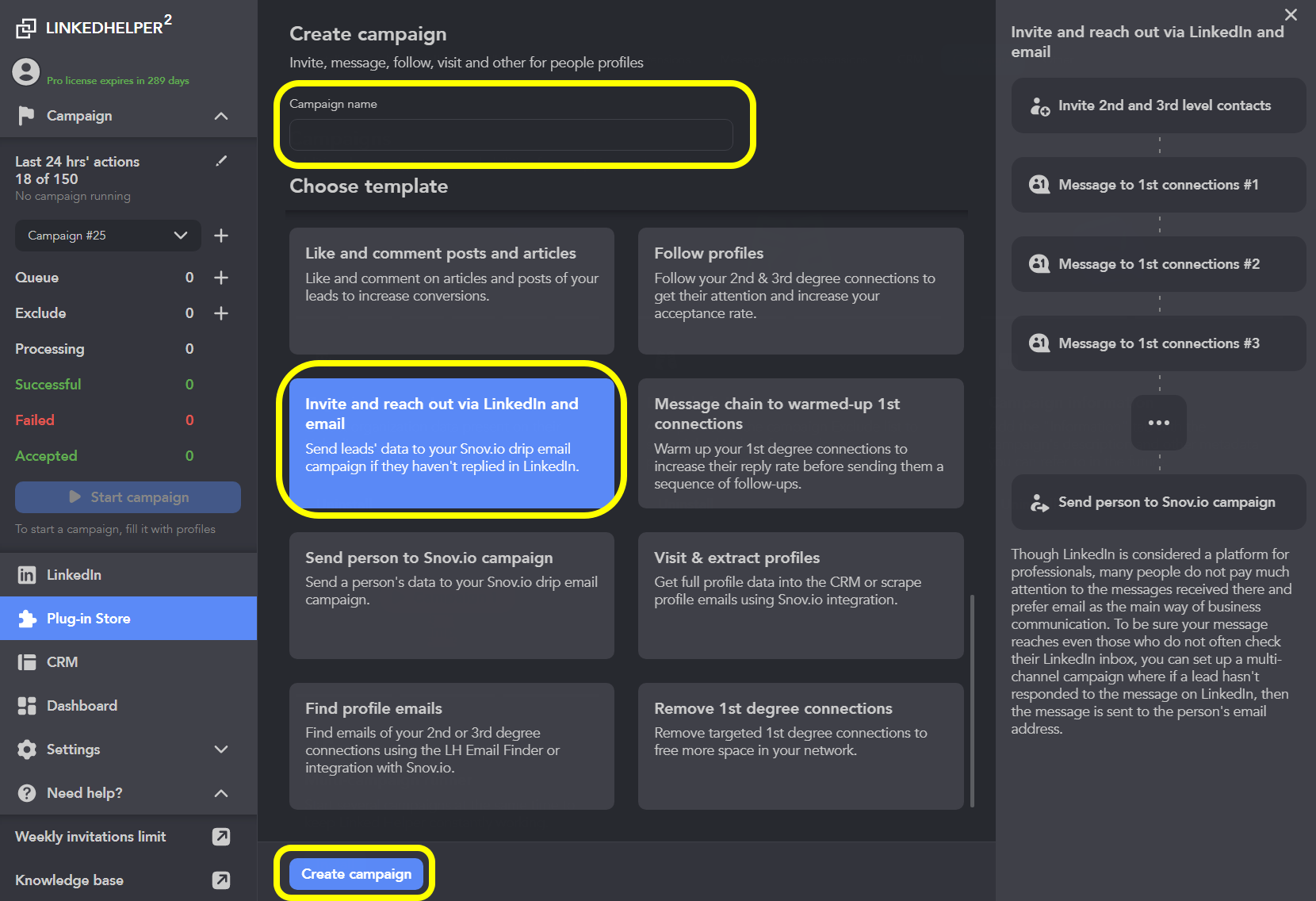 Si no desea enviar seguimientos, puede finalizar la creación de la campaña. En ese caso, Linked Helper solo invitará perfiles: