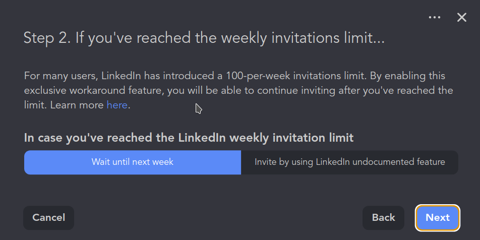 - Antes era posible habilitar una solución alternativa para superar el límite semanal de invitaciones de LinkedIn e invitar a más de 200 perfiles por semana. Lamentablemente, ya no funciona porque LinkedIn eliminó esta función no documentada de su sitio: