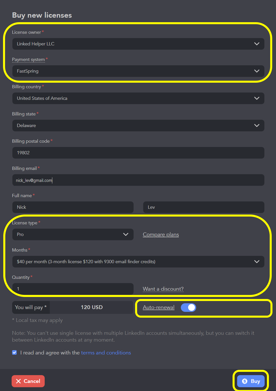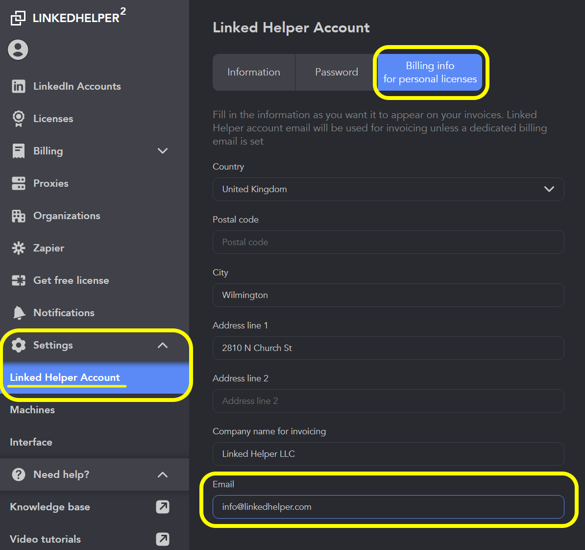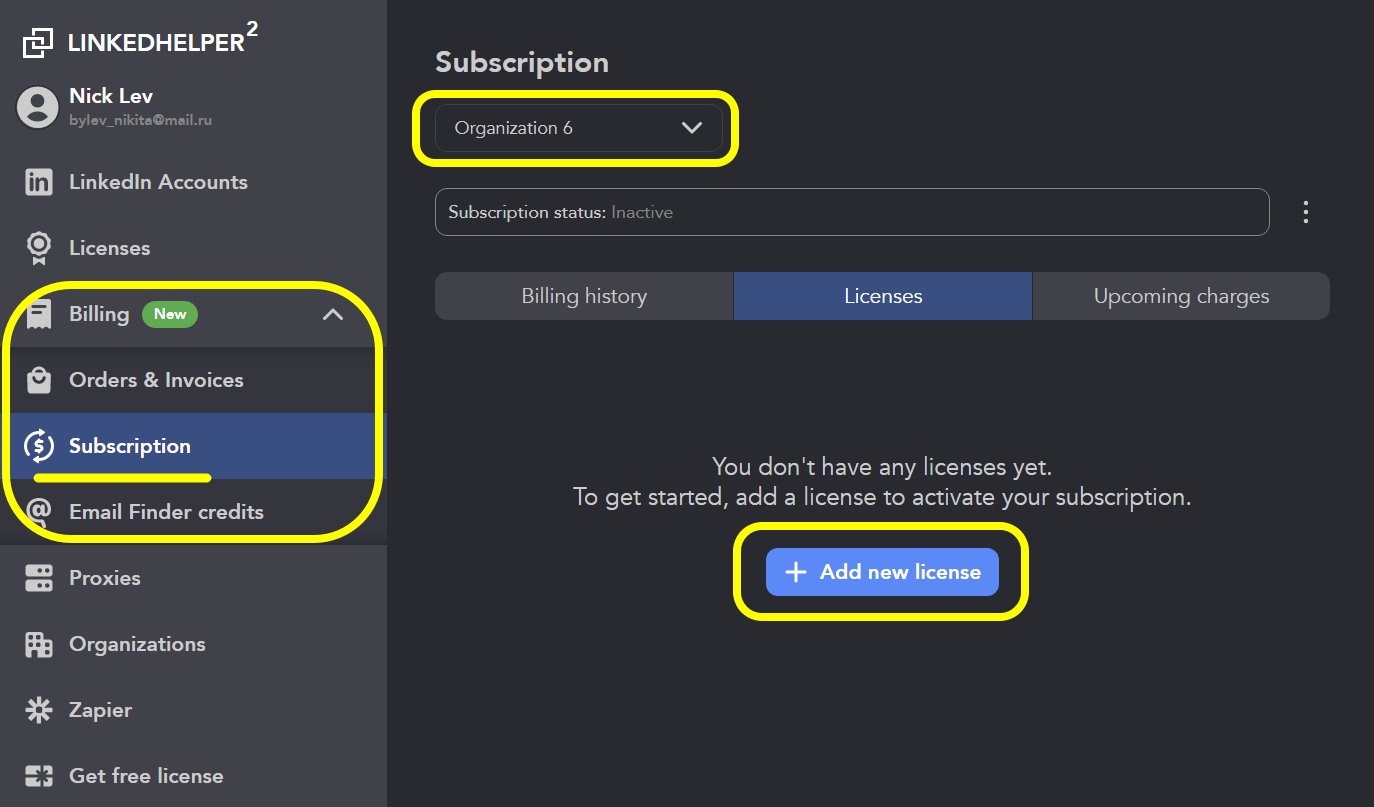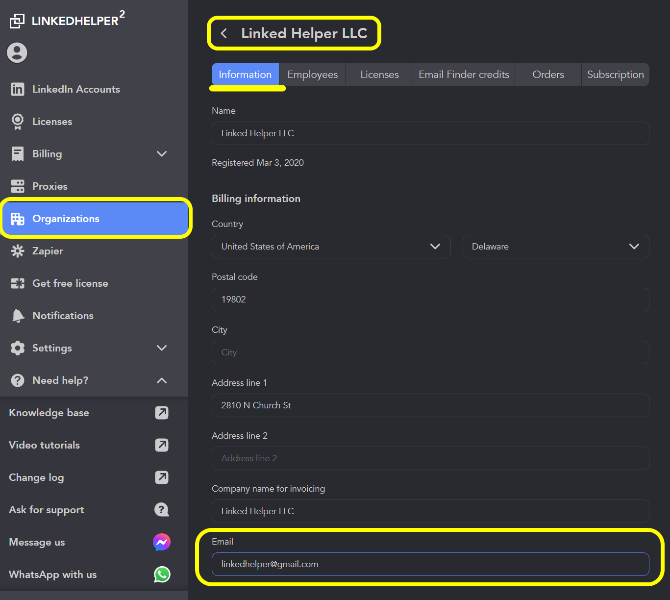 Todos sus pedidos y suscripciones de FastSpring están vinculados al correo electrónico de facturación que indicó en la información de facturación personal de Linked Helper o en la de su organización.