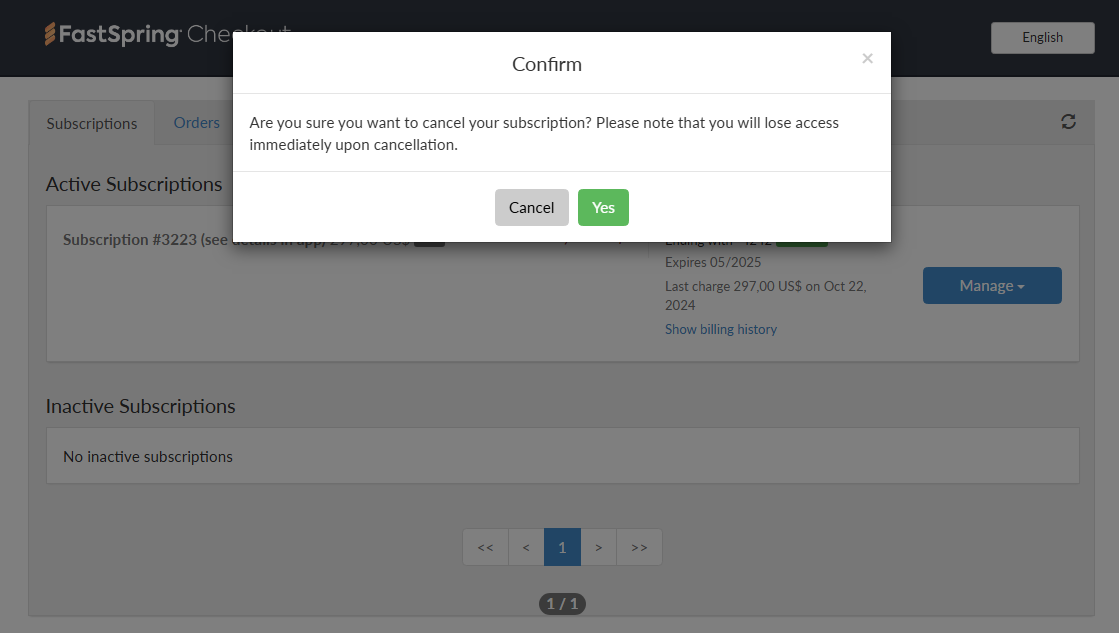 A la cuenta de pago: será redirigido a la cuenta de pago de FastSpring, donde podrá gestionar o cancelar su suscripción: