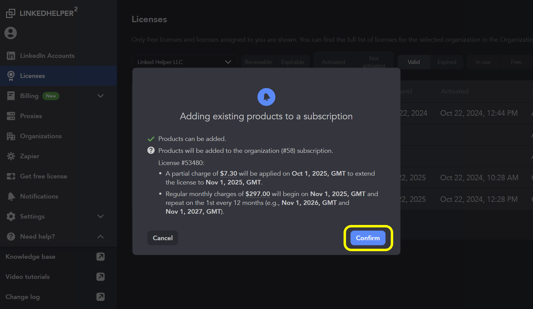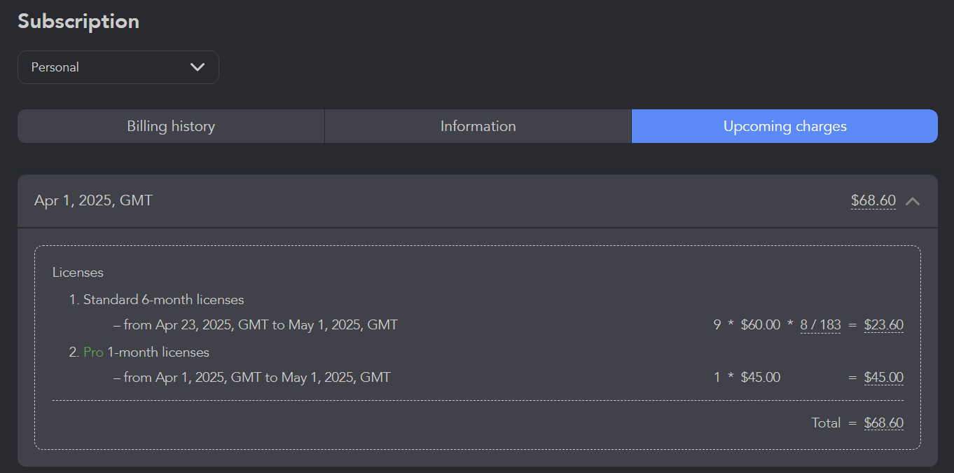 Por ejemplo, si creo una suscripción para 9 licencias Estándar de seis meses el 22 de octubre de 2024, las licencias caducan el 22 de abril de 2025. Linked Helper me cobra $540, luego traslada el día de pago del 22 de abril al 1 de mayo, lo que significa que el siguiente cobro de $540 será 8 días después de lo esperado.