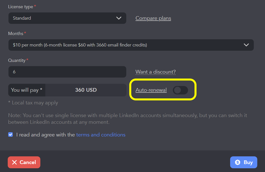 - Active la opción de Renovación automática en la parte inferior del panel derecho y haga clic en Comprar: