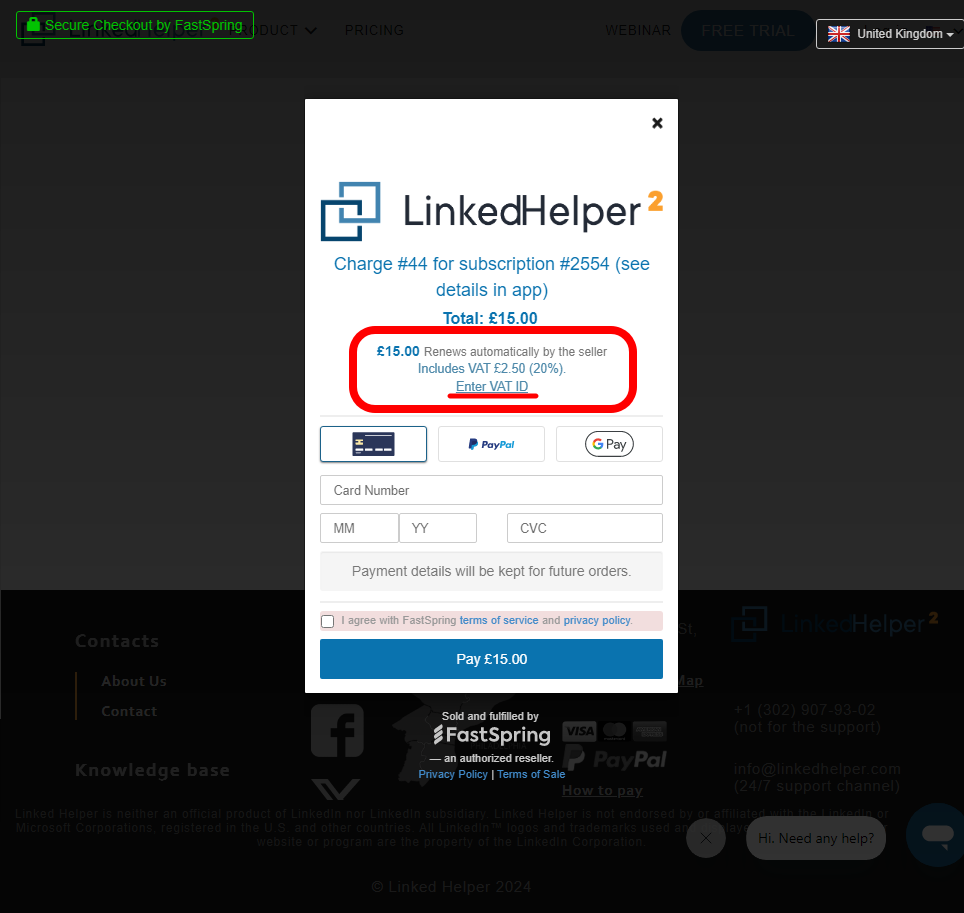- En la ventana emergente, revise el cargo de la suscripción, añada el NIF/IVA de su empresa si es necesario y complete la compra: