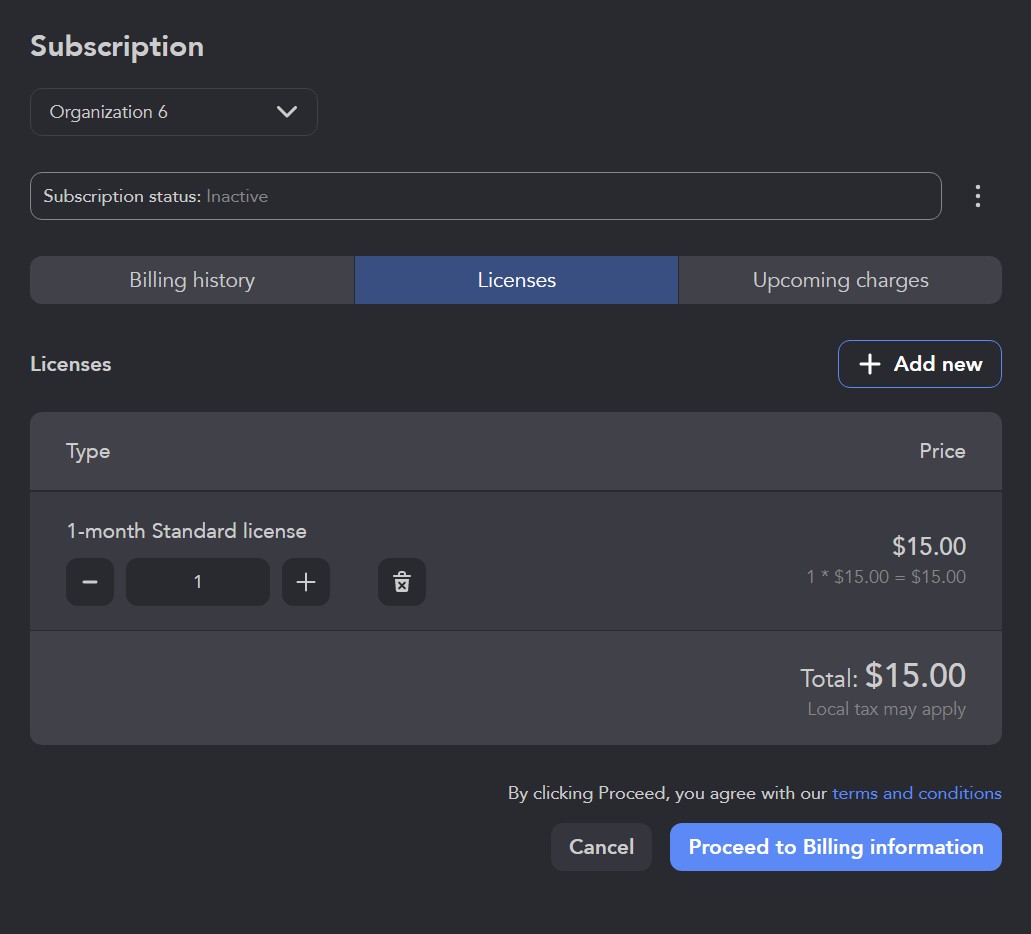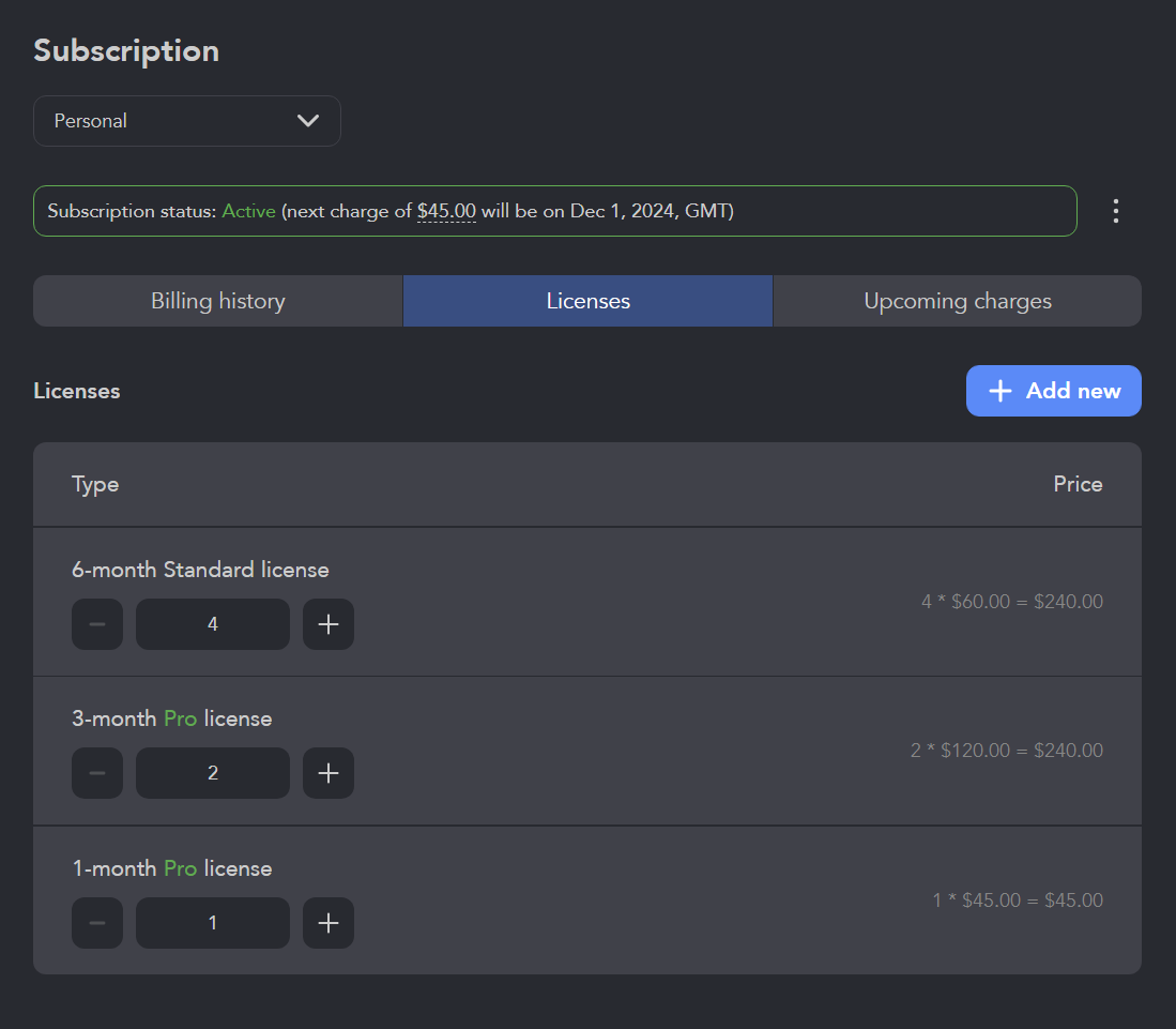 - 6 licencias PRO de seis meses (u otra opción anterior) se compraron usando el botón Comprar nueva en el menú Licencias sin habilitar la opción de renovación automática (en este caso, sin embargo, es posible agregar manualmente 6 licencias a la suscripción para obtener el 10% de descuento en los próximos cargos, pero no habrá descuento en el cargo actual):