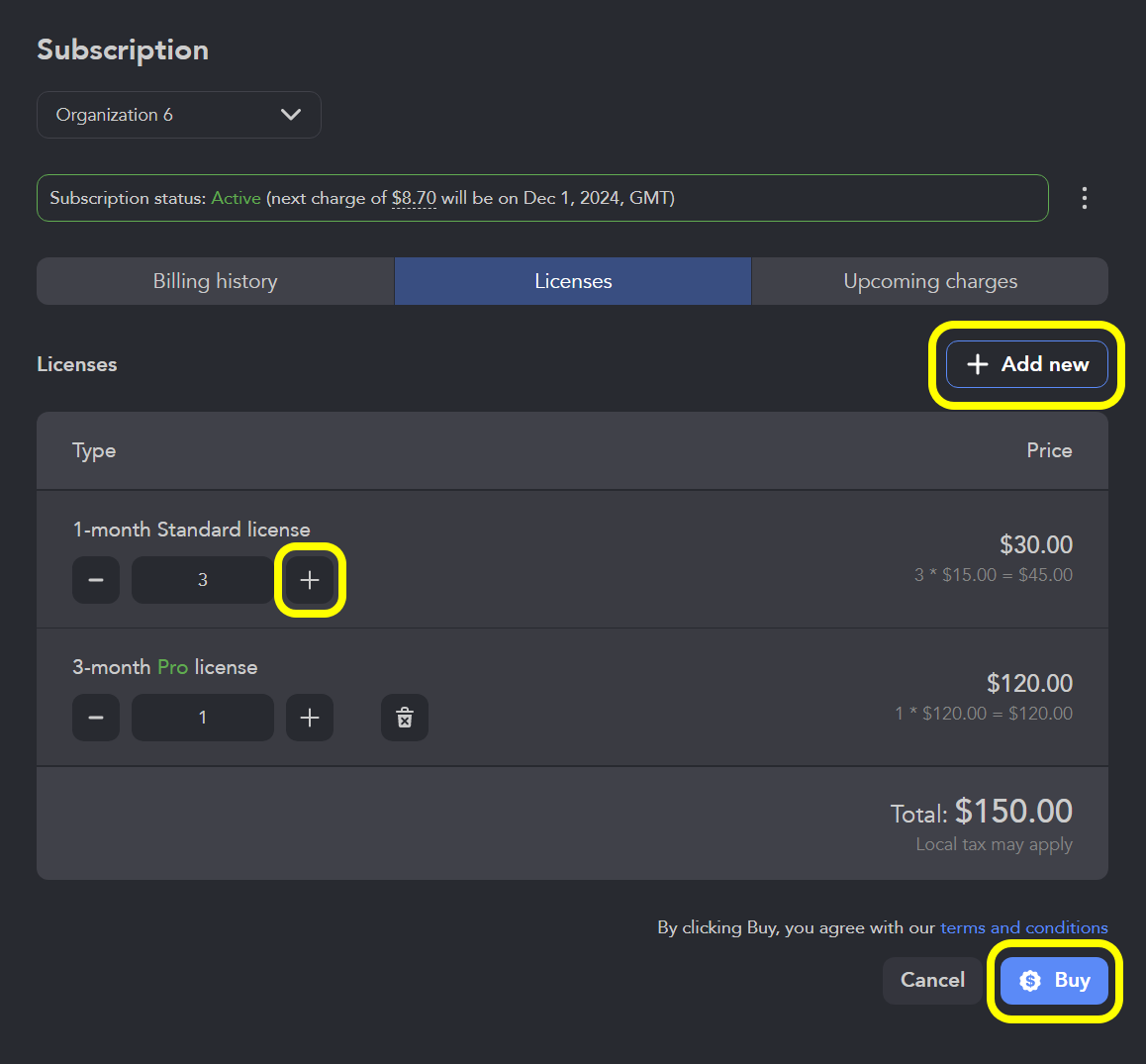 - Si desea agregar licencias del mismo tipo y duración, haga clic en el botón '+' (más) junto al número de licencias disponibles. Si necesita agregar licencias de otro tipo y/o duración, haga clic en '+Añadir nueva', elija tipo, cantidad, duración de las licencias y finalice el pedido: