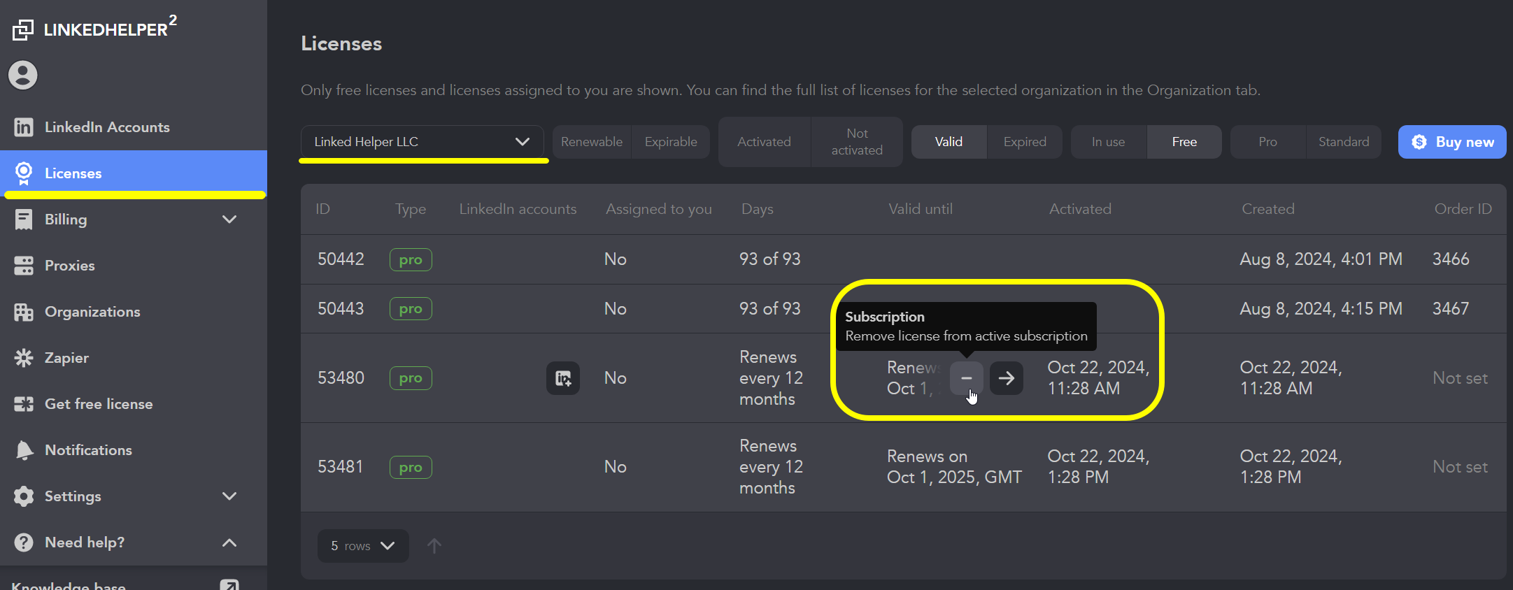 - Pase el ratón sobre la licencia, haga clic en el botón — (menos) que aparece bajo la columna Válido hasta y confirme la acción: