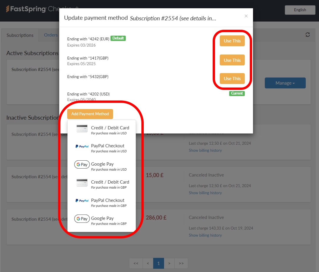 - Será redirigido a la cuenta de pago de FastSpring, donde podrá gestionar o cancelar su suscripción. Haga clic en Gestionar > Actualizar método de pago: