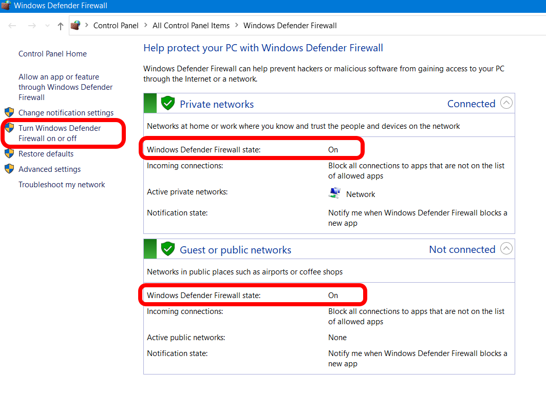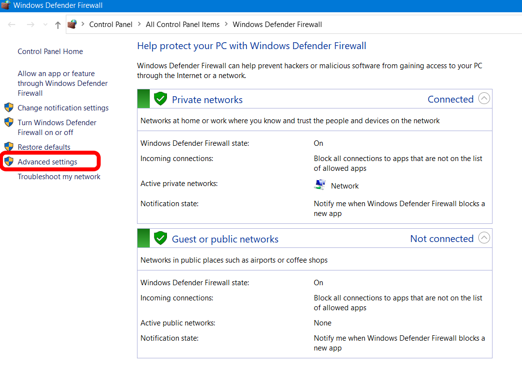 - Haga clic en el menú Inicio de Windows, escriba "firewall" y abra Windows Defender Firewall: