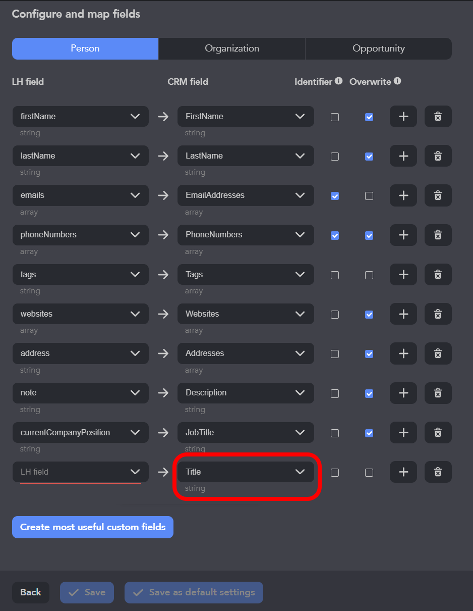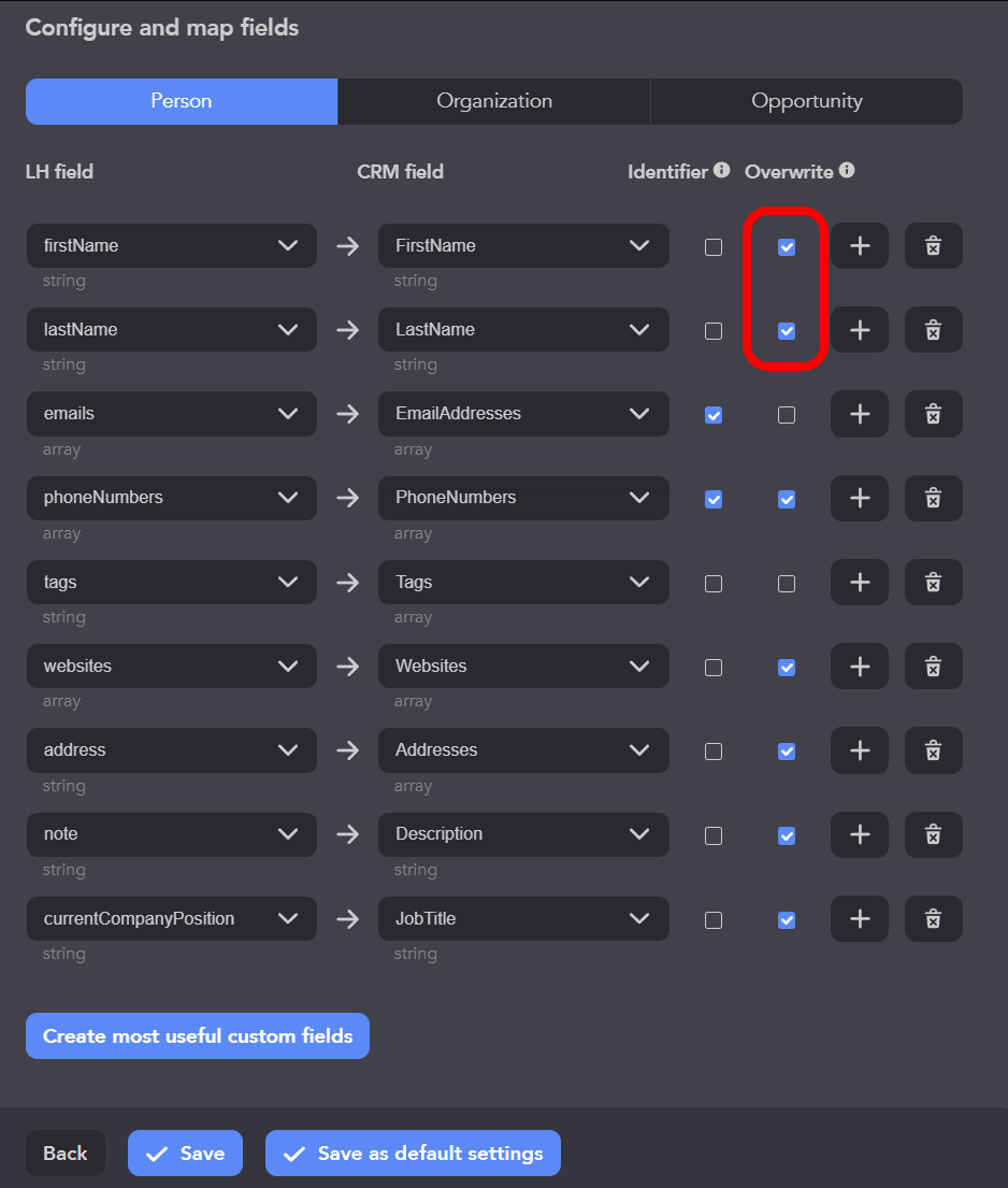 - Lorsqu'un profil est trouvé dans le CRM, Linked Helper envoie les données uniquement dans les champs vides et laisse les valeurs existantes inchangées. Si vous souhaitez mettre à jour la valeur d'un champ même s'il n'est pas vide, activez l'option d'écrasement pour ce champ.