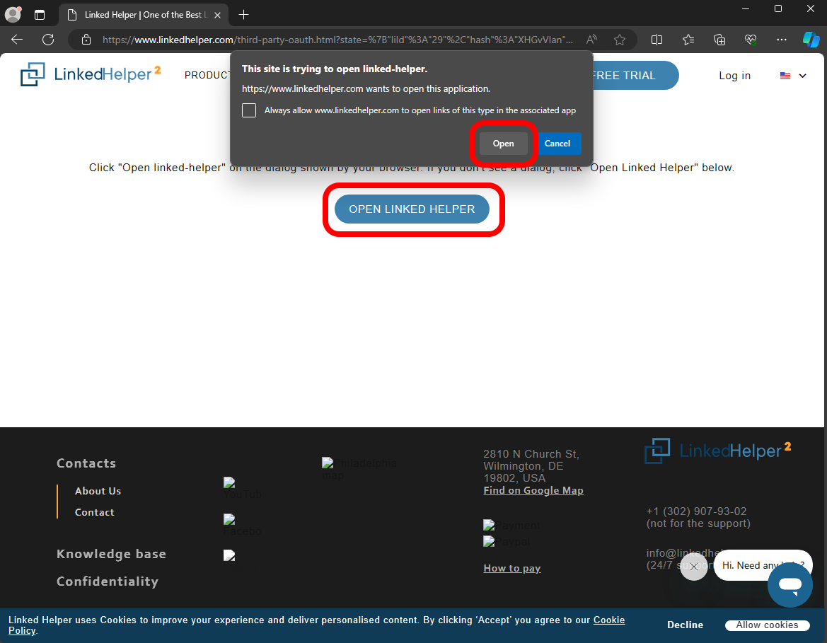 - Cliquez sur le bouton Ouvrir dans la fenêtre pop-up, ou si vous l'avez accidentellement annulée, cliquez sur le bouton Ouvrir Linked Helper sur la page :