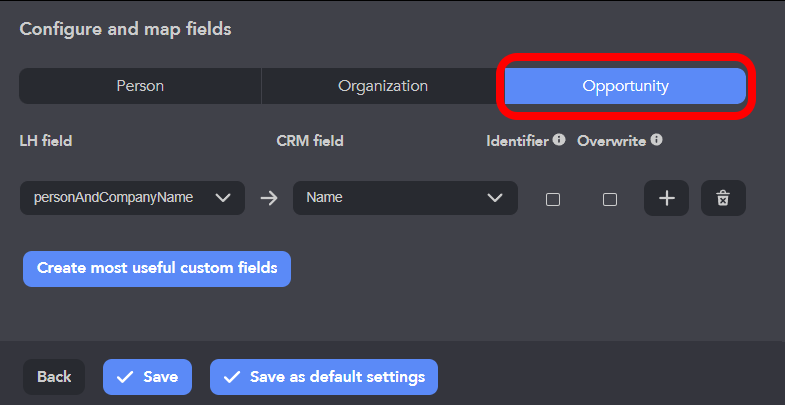 - Passer à l'onglet Organisation ou Opportunité pour choisir quels champs doivent être envoyés.
