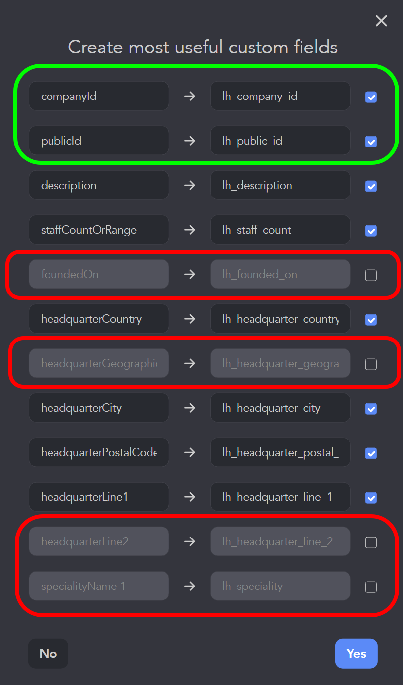 - Décochez les cases à côté des champs personnalisés que vous ne souhaitez pas créer pour les leads d'entreprise dans Capsule CRM. Il est recommandé de laisser les champs lh_company_id et lh_public_id pour éviter les doublons.