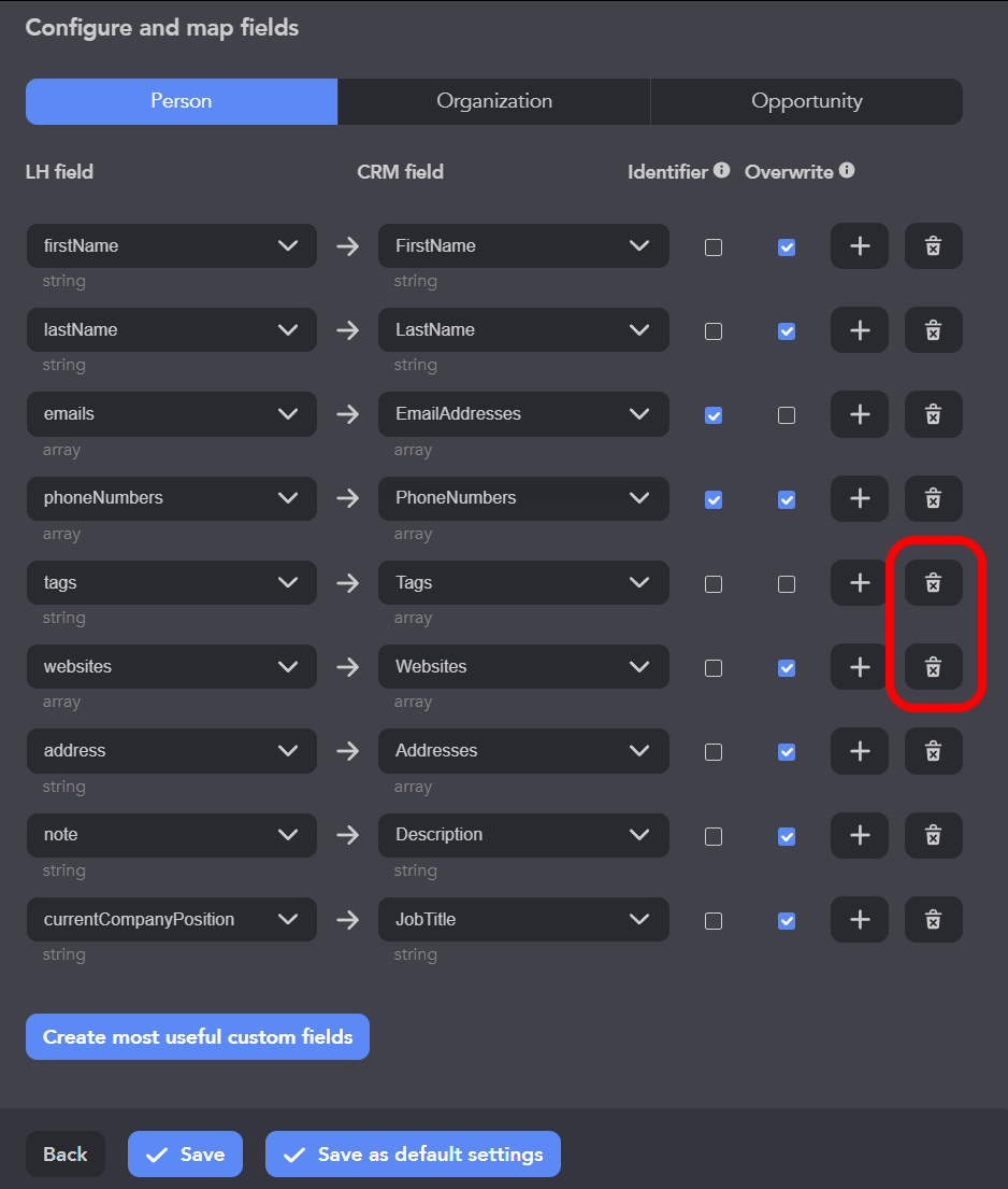 - Se não quiser criar certos campos no Capsule CRM caso não existam, você pode excluir o mapeamento clicando no botão da lixeira na última coluna.