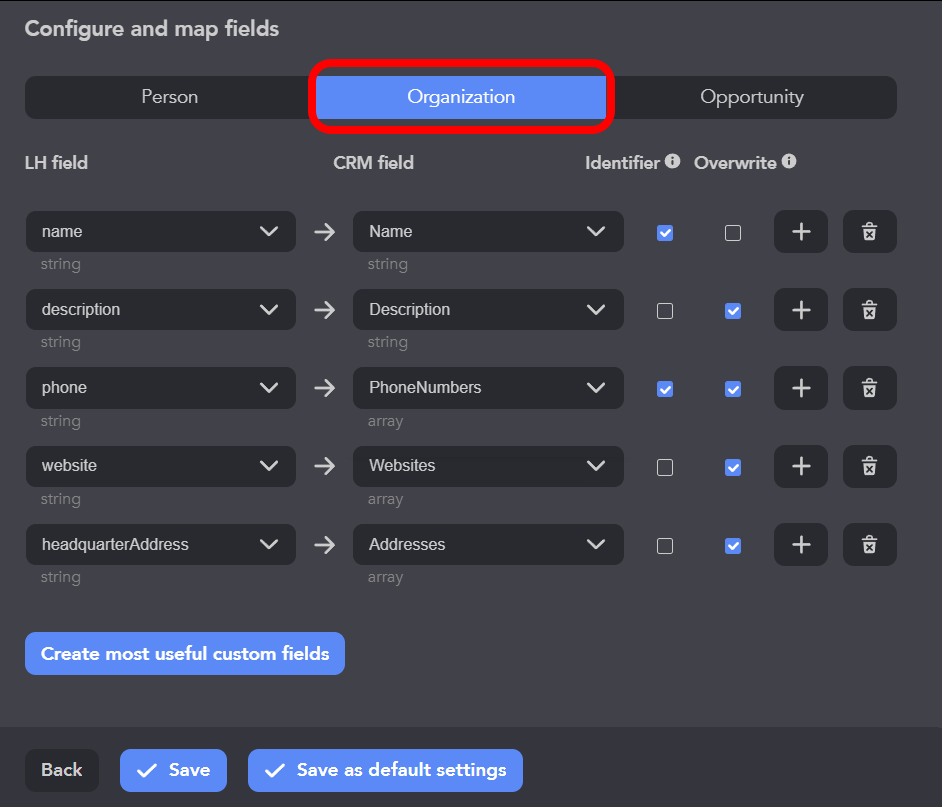 - Alternar para a aba Organização ou Oportunidade para escolher quais campos devem ser enviados.