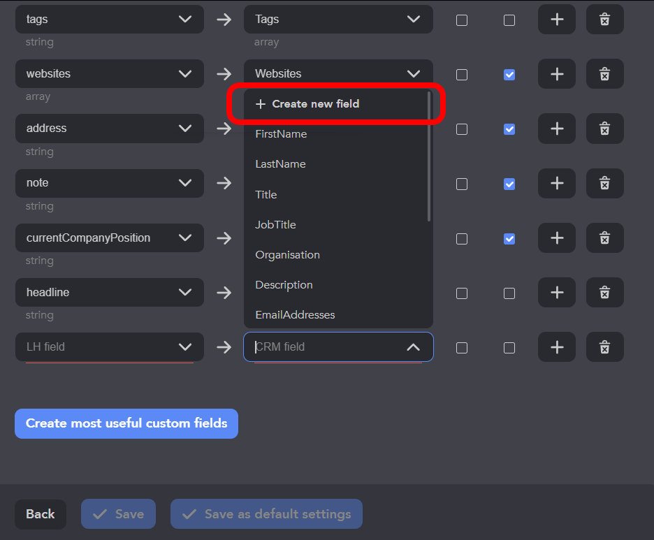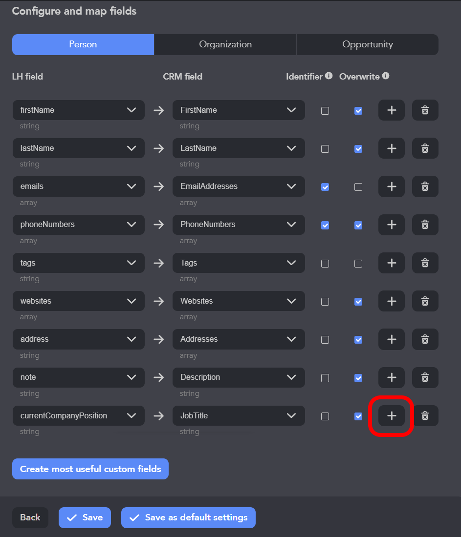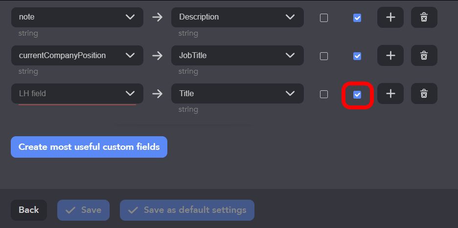 - Quando um perfil é encontrado no CRM, o Linked Helper envia dados apenas para campos vazios e mantém os valores existentes no CRM inalterados. Se quiser enviar dados para um campo e atualizar seu valor com novos dados do LinkedIn mesmo que o campo não esteja vazio, ative a opção de sobrescrever para esse campo.