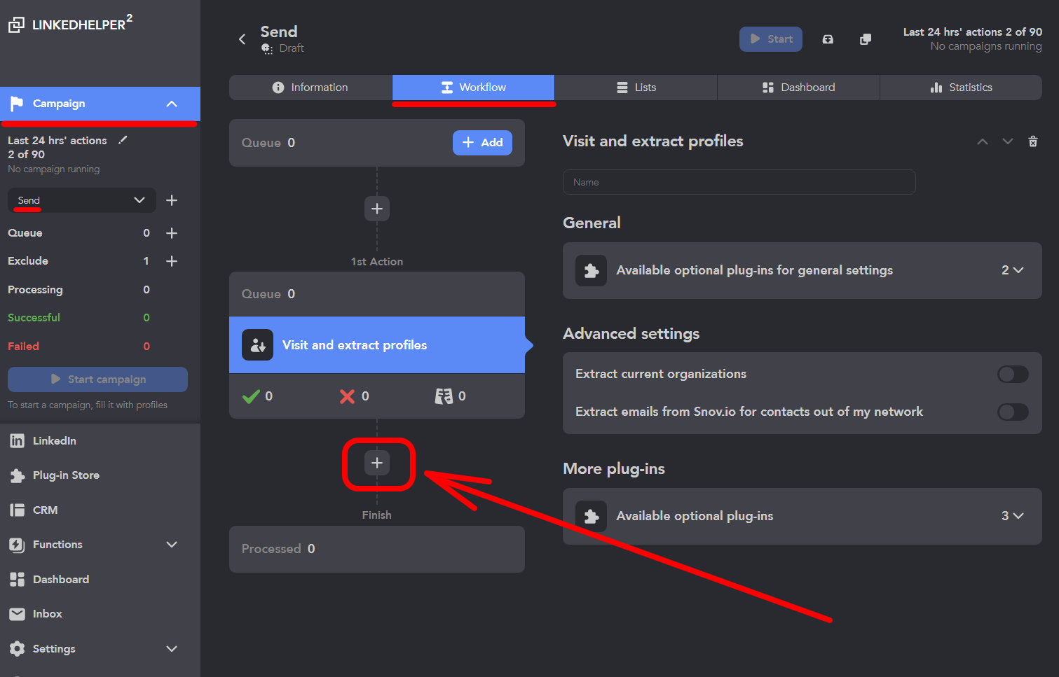 - Vá até a aba Workflow da sua campanha e clique no botão '+' abaixo da ação após a qual deseja enviar o perfil para o CRM: