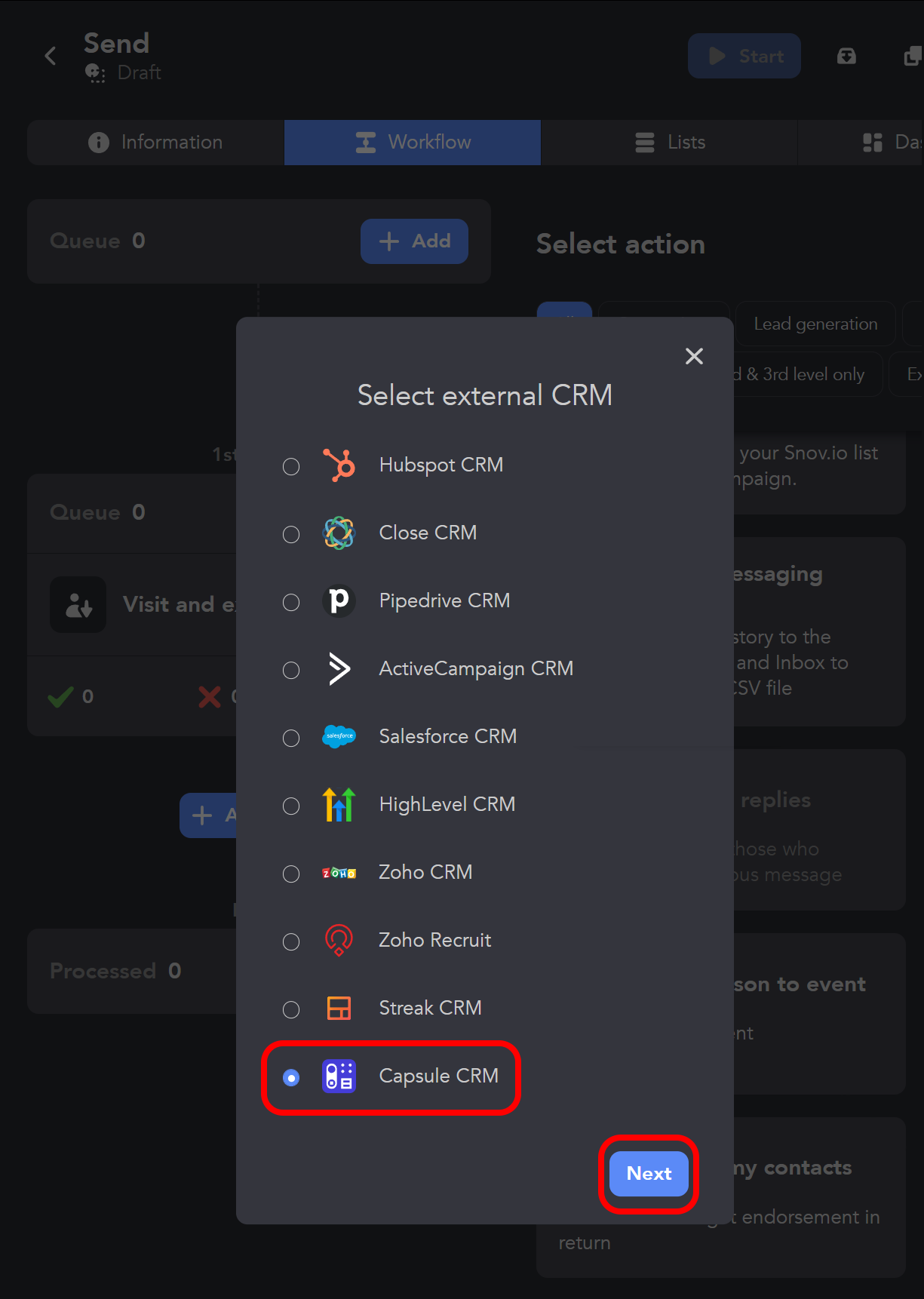 - Escolha Capsule CRM, clique em Próximo e siga as instruções da próxima seção do artigo: