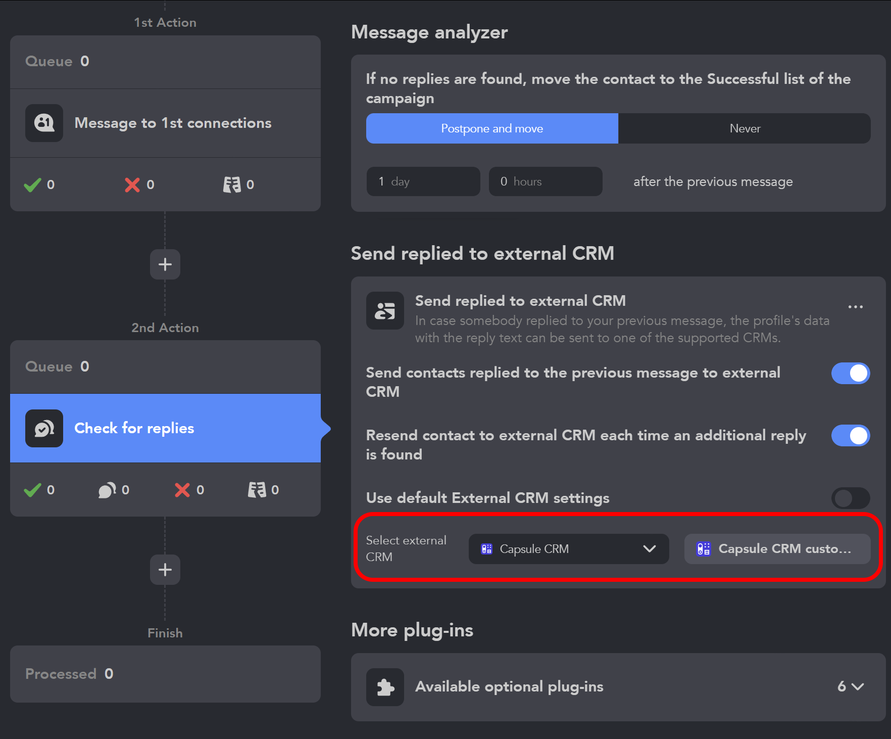 - Ao enviar um perfil para o Capsule CRM, o Linked Helper procura uma correspondência entre os identificadores do perfil e dos leads no Capsule CRM; se não encontrar, o Linked Helper cria um novo lead.