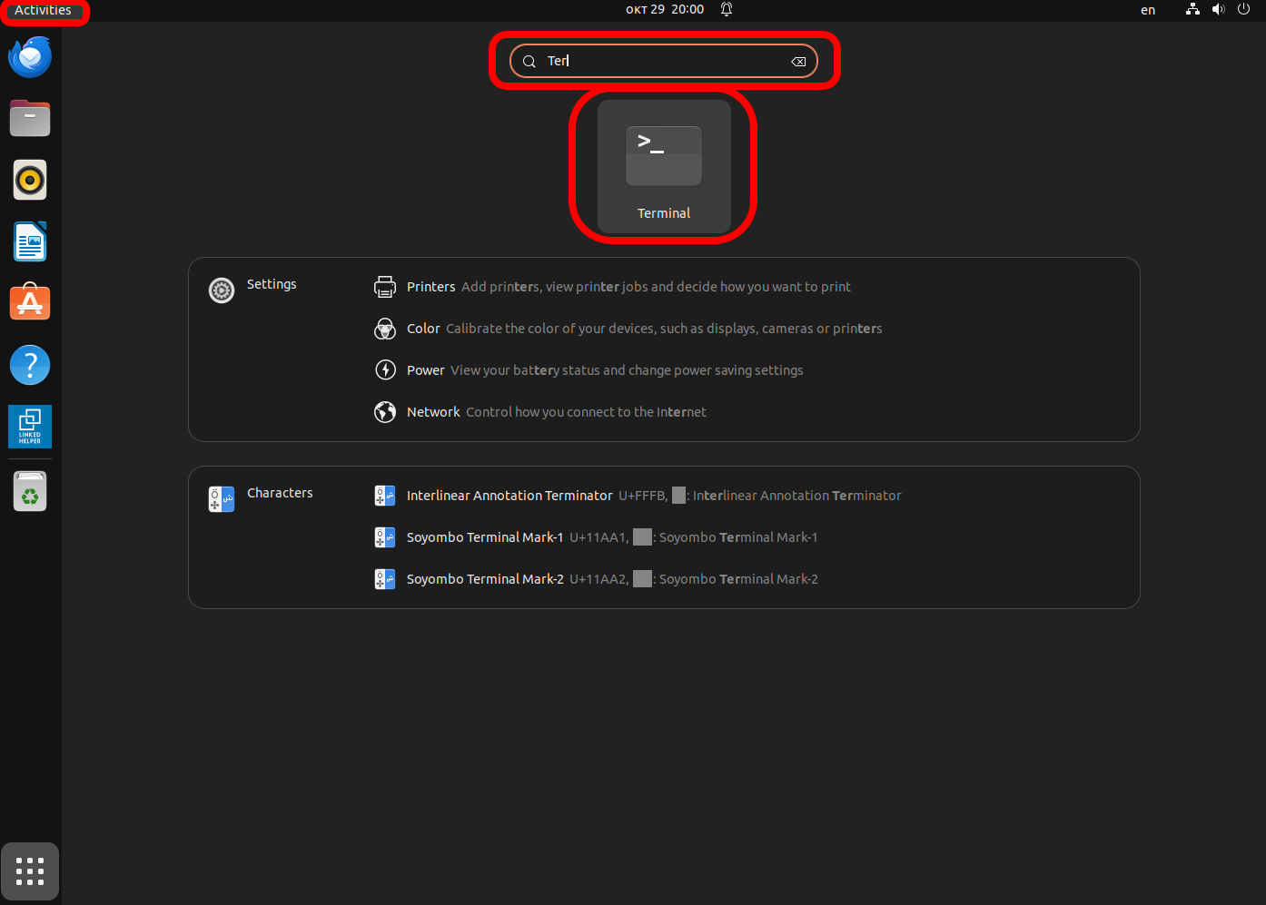 - Clique em Atividades, digite "Terminal" e abra-o: