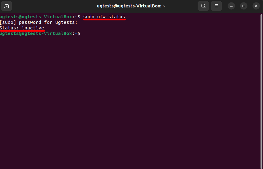 - Para verificar o status do firewall, digite o comando abaixo, pressione Enter e forneça sua senha de usuário, se necessário: