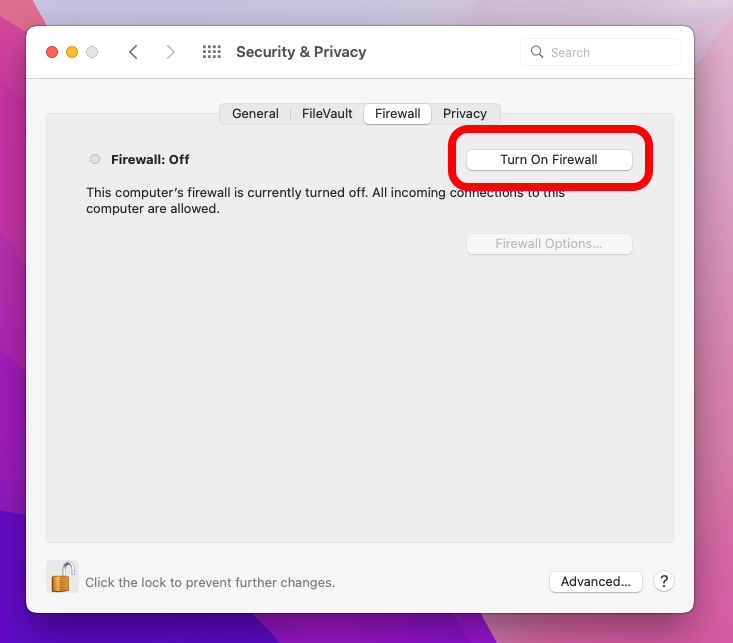 Você deve verificar se o firewall está ativado e garantir que ninguém de fora consiga passar por ele.