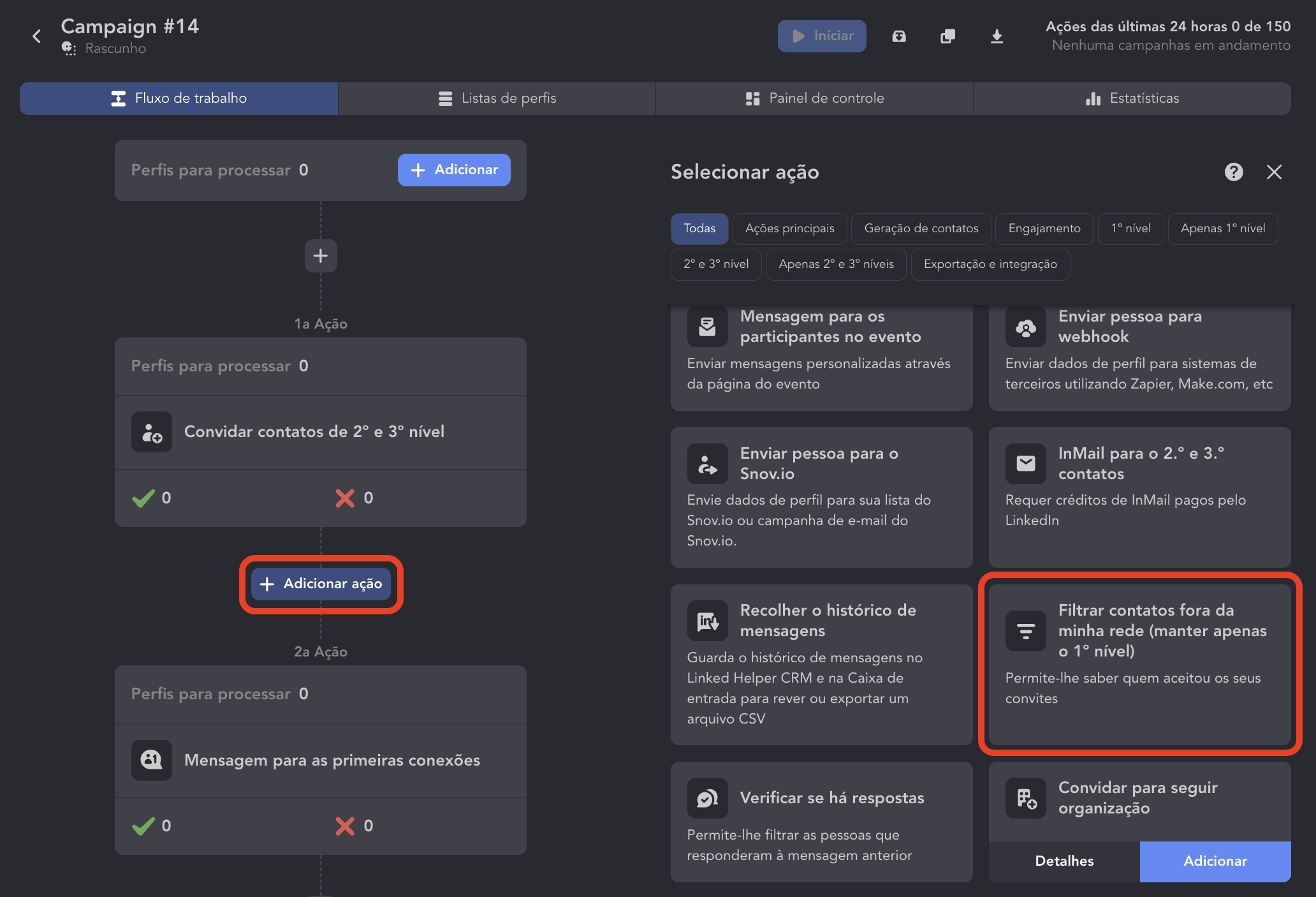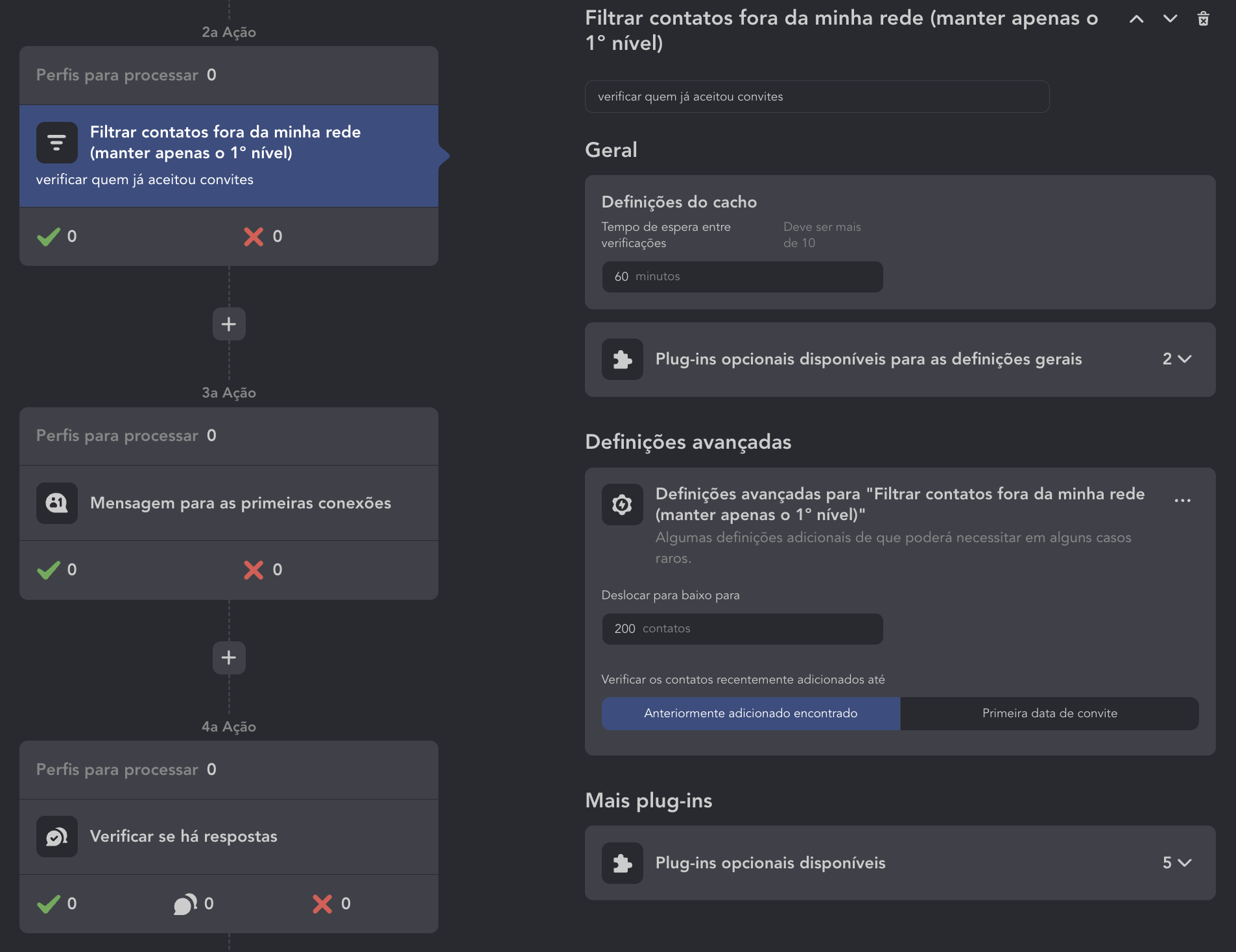 A ação Filtrar contatos fora da minha rede (manter apenas o 1º nível) funciona em ciclos: ela verifica quem aceitou seu convite a cada X minutos (60 por padrão) e os move adiante. Se ninguém for encontrado, provavelmente nenhum convite foi aceito;