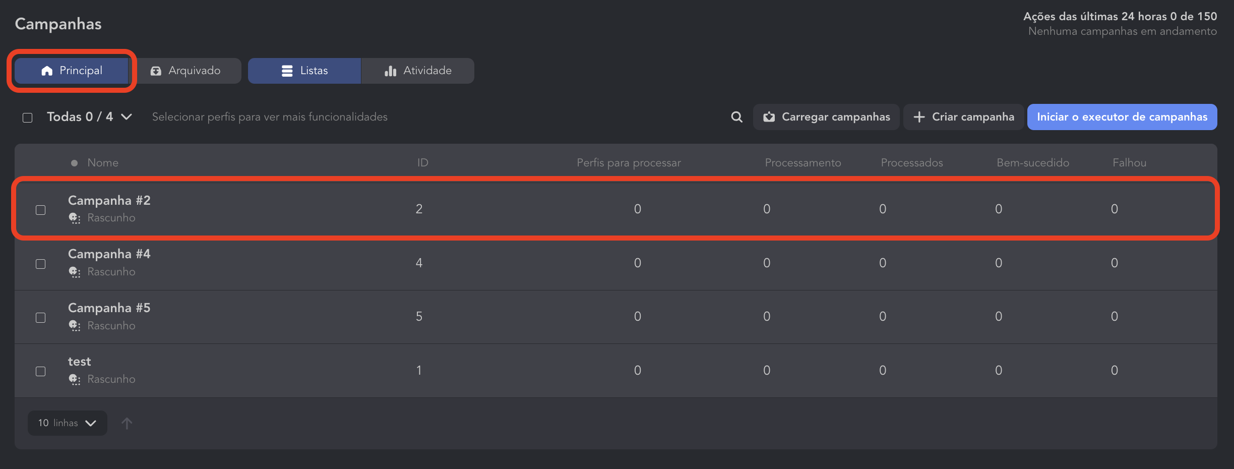 - Selecione novamente o filtro Principal e verifique a campanha desarquivada.